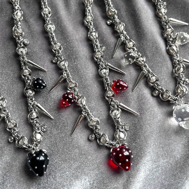 不揃いの淡水パールを使用したネックレスです。 大きなガラスのハートと長い棘があなたを強く美しく見せてくれます。 パールは1つ1つ形が違うため、全く同じものはありません。あなただけの特別な1点です。