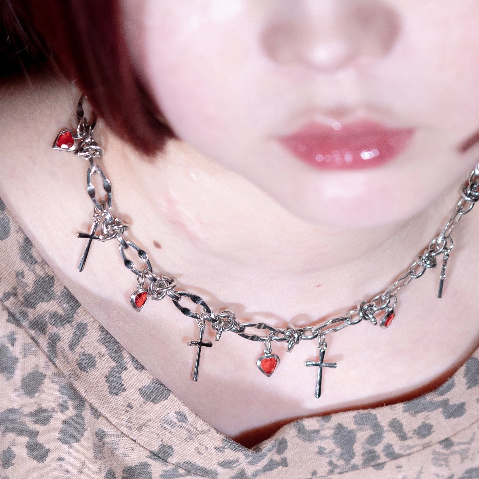 絡まったようなデザインのチェーンに十字架とハートのチャームをつけました。